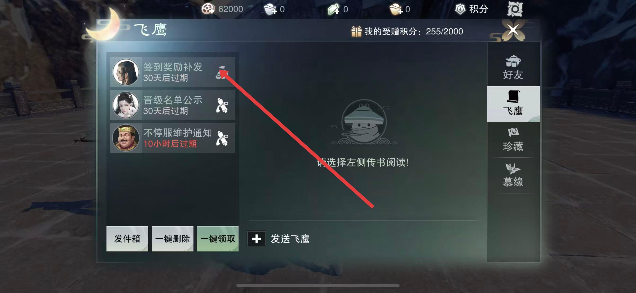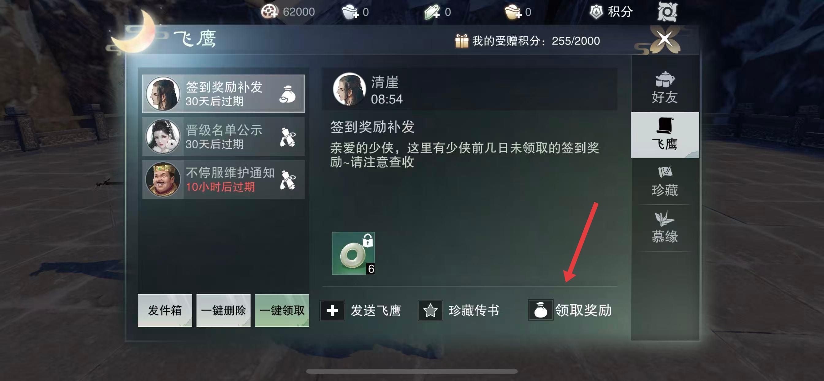 3、點(diǎn)擊郵件后,界面右側(cè)會(huì)顯示郵件的具體內(nèi)容,點(diǎn)擊下方的領(lǐng)取獎(jiǎng)勵(lì)按鈕。
