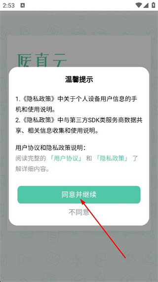 1、打開醫(yī)真云,在彈出的窗口中點擊同意并繼續(xù)。