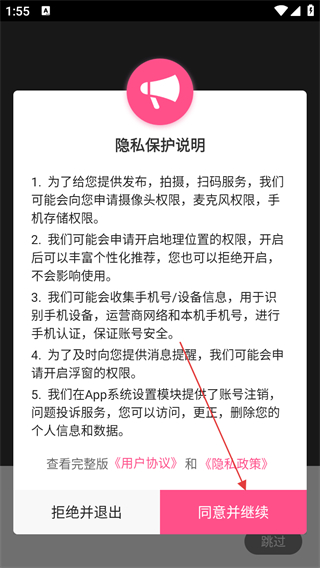 1、打開輕加減肥APP,在隱私保護說明頁面,點擊同意并繼續(xù)。