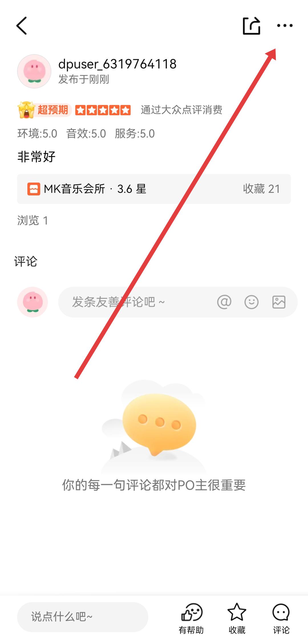 2、點(diǎn)擊這個(gè)點(diǎn)評(píng)進(jìn)入我們之前評(píng)論的詳情頁(yè),然后點(diǎn)擊頁(yè)面右上角的···按鈕,展開操作菜單。