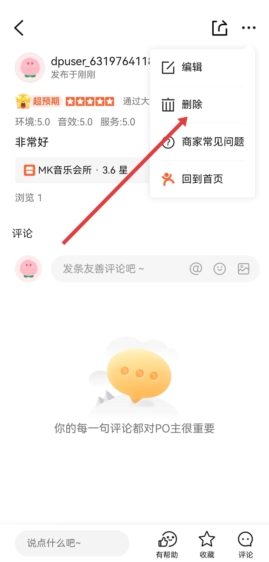 3、在彈出的功能菜單中,我們需要點(diǎn)擊刪除的這個(gè)選項(xiàng),即可按照提示完成點(diǎn)評(píng)刪除的操作。
