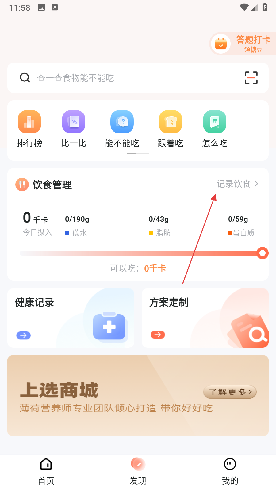 1、打開薄荷營養(yǎng)師APP,在首頁找到記錄飲食選項并點(diǎn)擊。