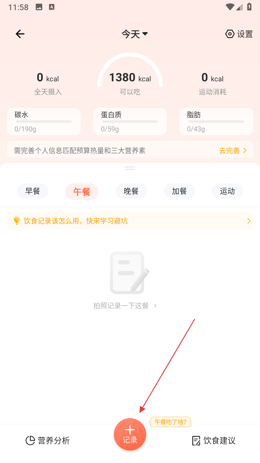 2、在飲食記錄界面選擇要記錄的餐次,點(diǎn)擊頁面下方的記錄按鈕。