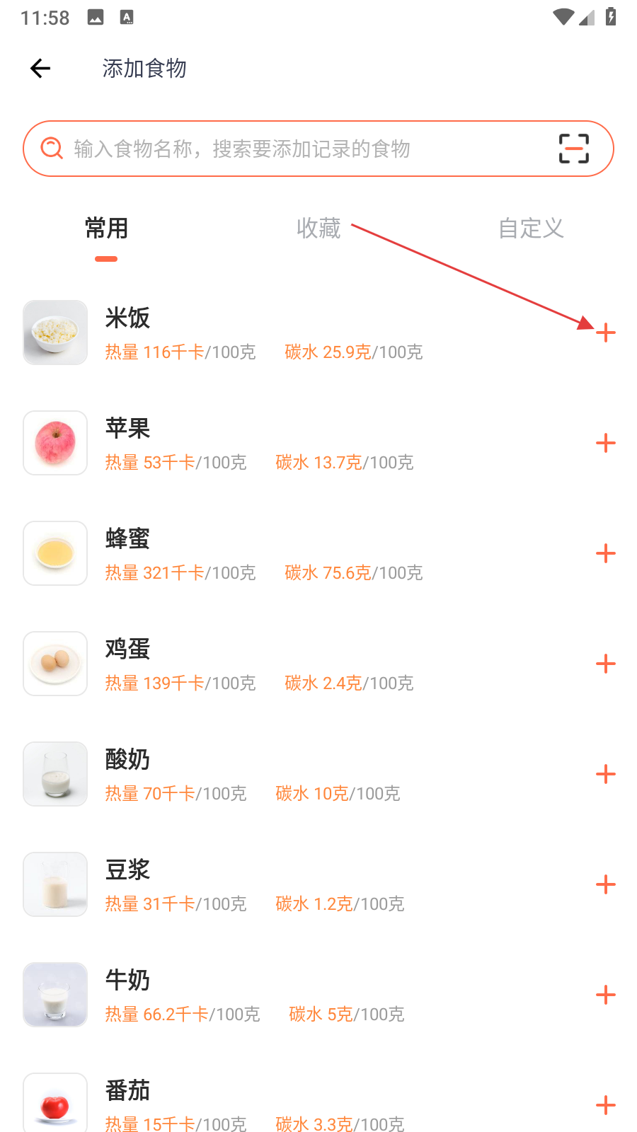 3、進(jìn)入添加食物頁面后,找到目標(biāo)食物后點(diǎn)擊其右側(cè)的+號。