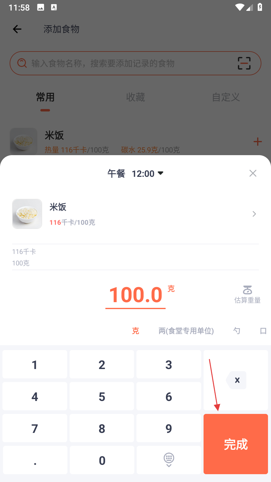 4、輸入或選擇食物的重量,還可切換單位,確認(rèn)后點(diǎn)擊完成。