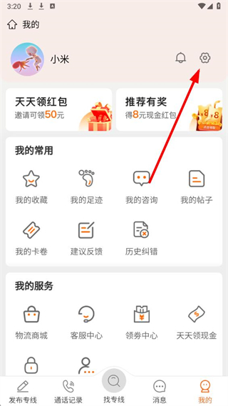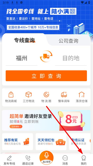 1、在陸小滿物流助手app首頁(yè),點(diǎn)擊右下角我的按鈕,進(jìn)入個(gè)人頁(yè)面。