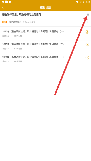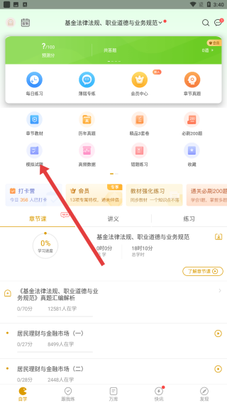 1、在基金法律法規(guī)-職業(yè)道德與業(yè)務(wù)規(guī)范學(xué)習(xí)界面,點(diǎn)擊模擬考試圖標(biāo),進(jìn)入模擬試題頁(yè)面,開(kāi)啟對(duì)應(yīng)科目的練習(xí)進(jìn)程,助力備考積累經(jīng)驗(yàn)。