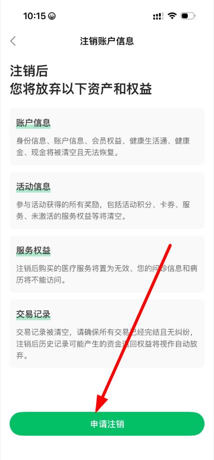 5、在注銷賬戶信息頁面,仔細閱讀注銷后放棄的資產(chǎn)和權(quán)益說明,點擊申請注銷,完成賬號注銷操作。