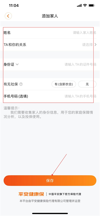 3、在添加家人頁面填寫姓名、關(guān)系、身份證等信息后,點擊保存,完成家人信息添加。
