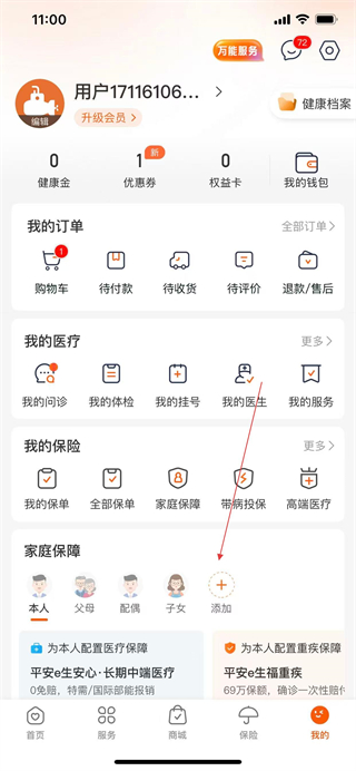 2、在個人中心頁面的家庭保障板塊中,點擊添加,進入添加家人頁面。