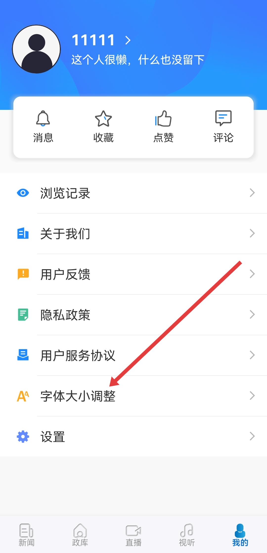 2、在個人頁面中,找到并點擊字體大小調(diào)整選項,進入字號的調(diào)整界面。