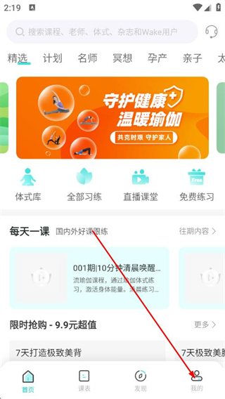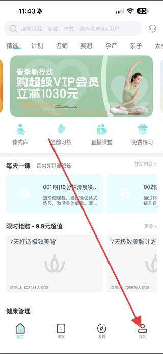 1、打開Wake瑜伽APP,點擊底部導航欄的我的選項,進入個人頁面。