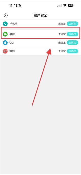 4、在賬戶安全頁面點擊微信右側的去綁定按鈕,即可完成微信綁定操作。