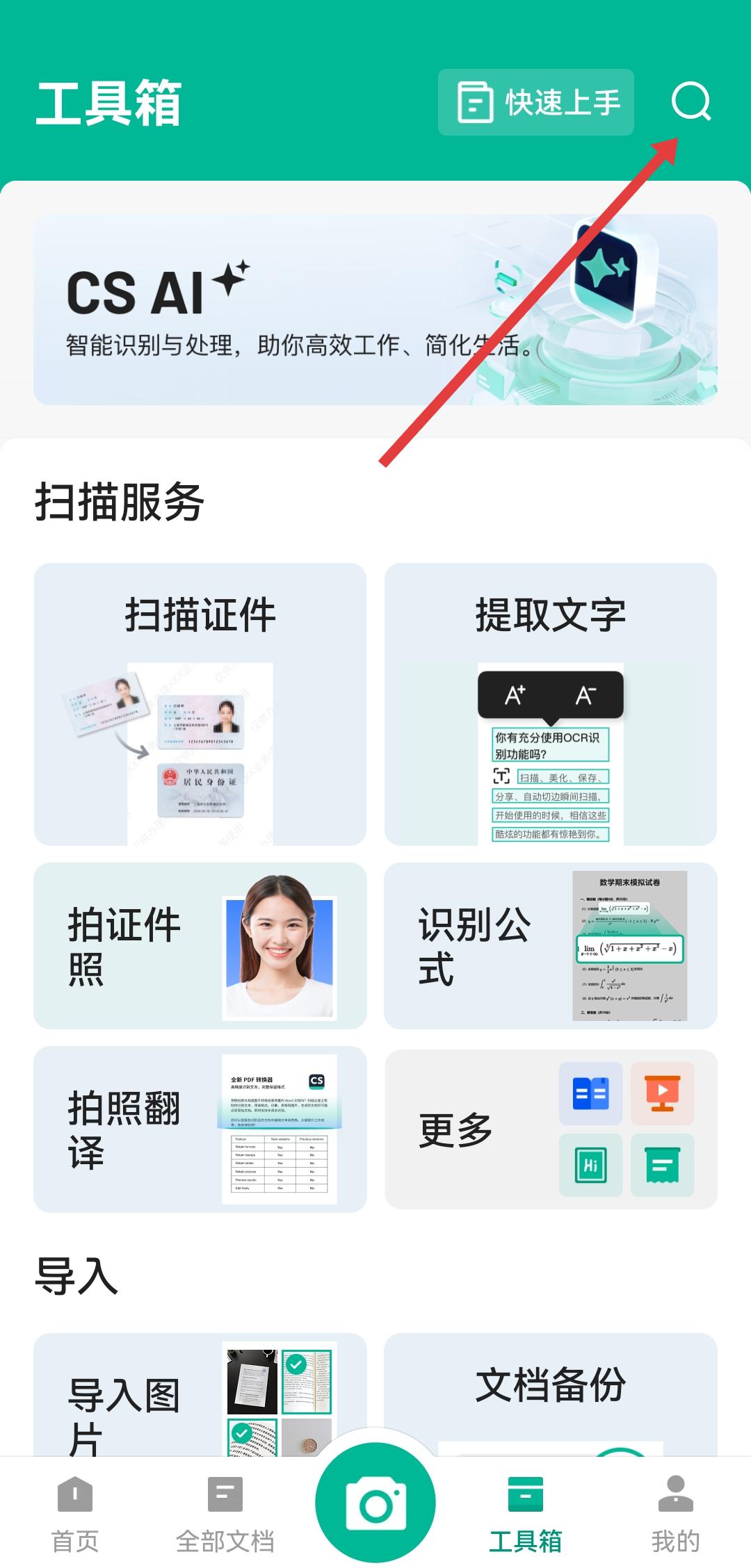 1、打開掃描全能王APP,進(jìn)入工具箱的頁(yè)面,點(diǎn)擊右上角放大鏡形狀的搜索圖標(biāo),在搜索框輸入水印。