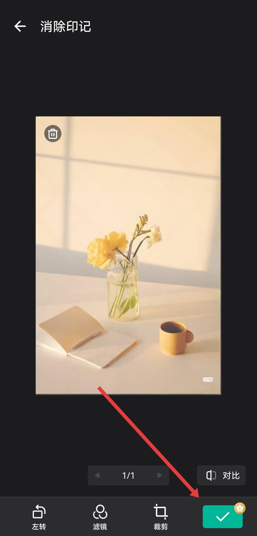 3、進(jìn)入消除印記編輯頁(yè)面后,系統(tǒng)自動(dòng)識(shí)別并處理水印,確認(rèn)效果后點(diǎn)擊右下角綠色對(duì)勾按鈕,完成去水印操作。