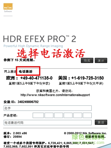 2、安裝完成后,在PS里啟動(dòng)Silver Efex Pro 2濾鏡程序,會(huì)彈出激活窗口,點(diǎn)擊“電話激活”。