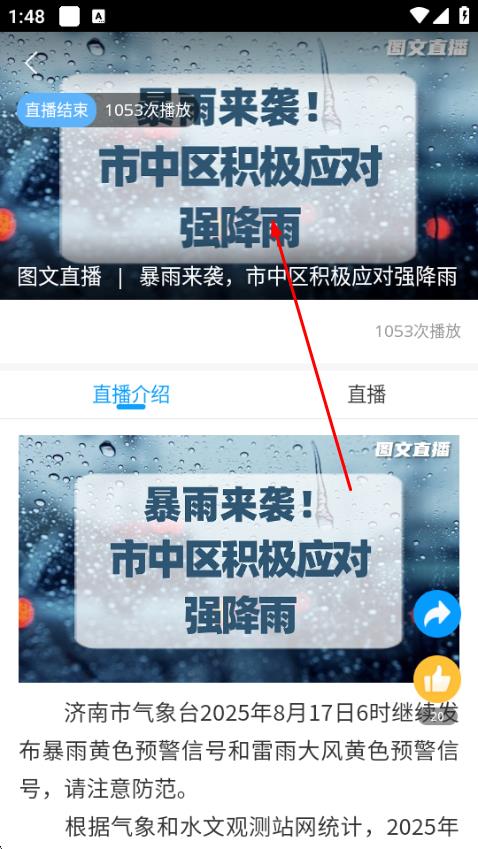 3、進(jìn)入直播詳情頁面,點擊播放區(qū)域即可觀看直播視頻。