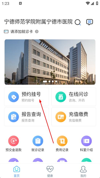 1、在寧德市醫(yī)院app首頁,點擊預(yù)約掛號選項。