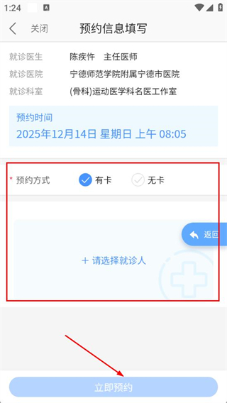 5、在預(yù)約信息填寫頁面,選擇預(yù)約方式、添加就診人后點擊立即預(yù)約。