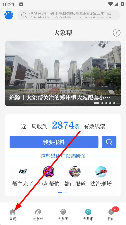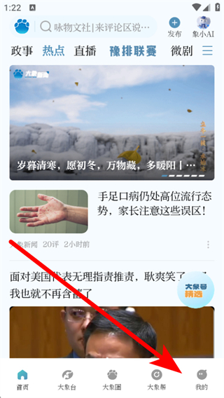 1、打開大象新聞App,點(diǎn)擊底部導(dǎo)航欄中的首頁選項(xiàng),進(jìn)入首頁界面。