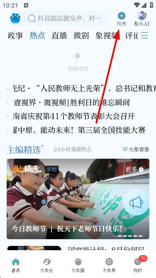 2、在首頁右上角,點(diǎn)擊發(fā)布按鈕,進(jìn)入內(nèi)容發(fā)布頁面。