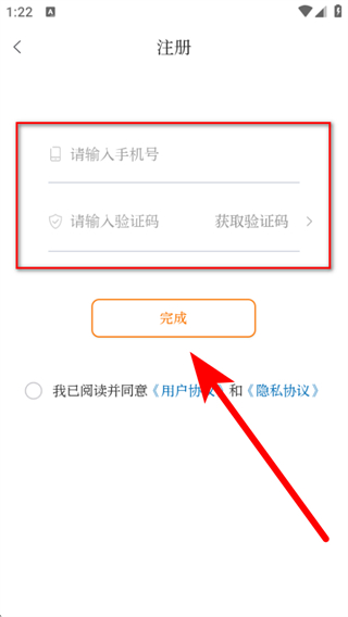 4、在注冊(cè)頁面,輸入手機(jī)號(hào)等信息后,點(diǎn)擊完成即可完成注冊(cè)。