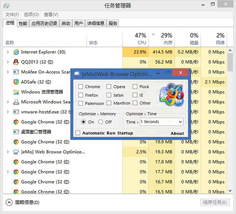 運(yùn)行[eMo]Web Browse Optimizer后,勾選需要優(yōu)化的瀏覽器,調(diào)整優(yōu)化時(shí)間(默認(rèn)是一秒),最后點(diǎn)擊optimize:memory下的“on”按鈕,就會(huì)看到立竿見(jiàn)影的效果。