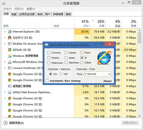 瀏覽器內(nèi)存優(yōu)化(Web Browse Optimizer)是專為瀏覽器記憶體最佳化的工具,適用 IE、Chrome、firefox、Opera、Safari.......等等的主流瀏覽器。