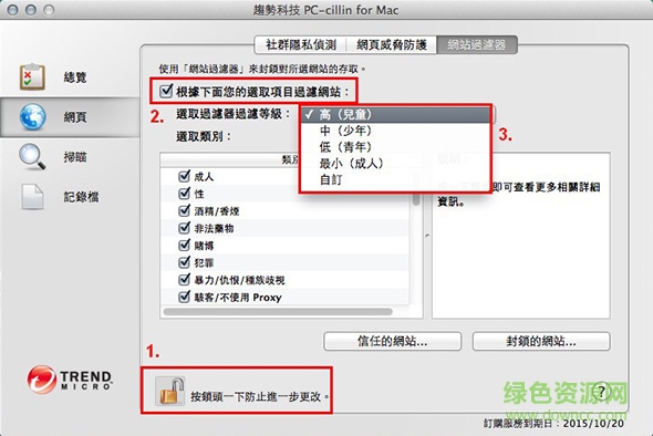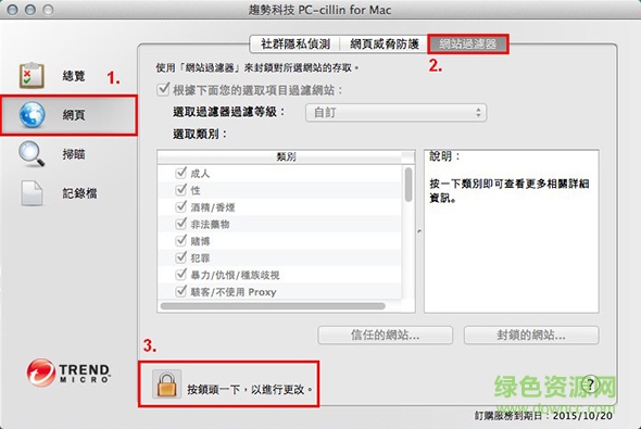 點選「網頁」; 選擇「網站過濾器」;按下「鎖頭」進行解鎖。