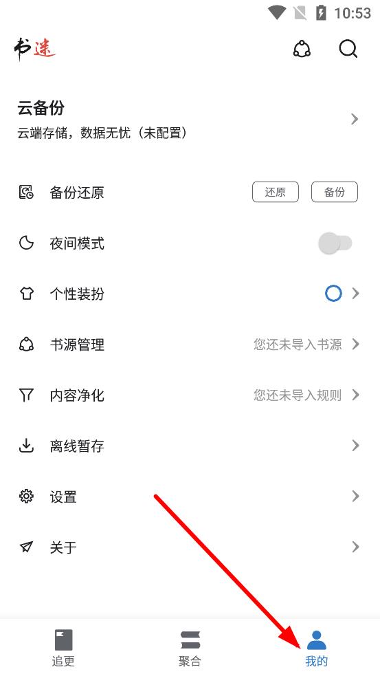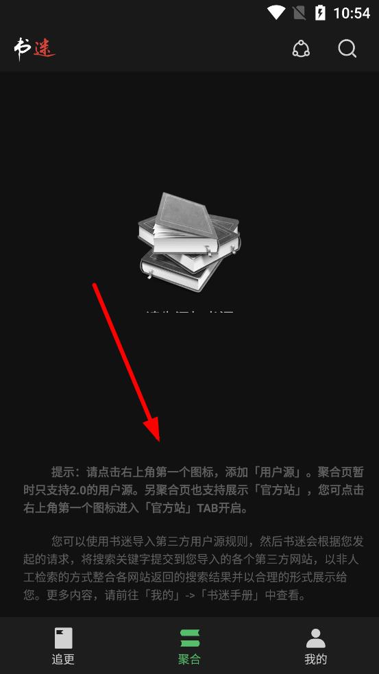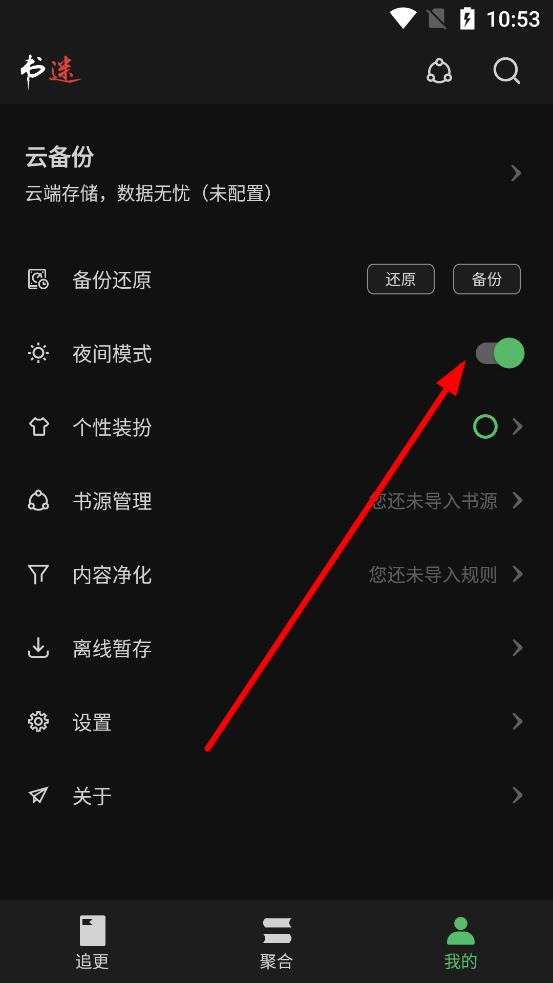 3、開(kāi)啟夜間模式后,返回應(yīng)用主界面,如在聚合頁(yè)等界面,即可在夜間模式下使用書(shū)迷應(yīng)用閱讀。
