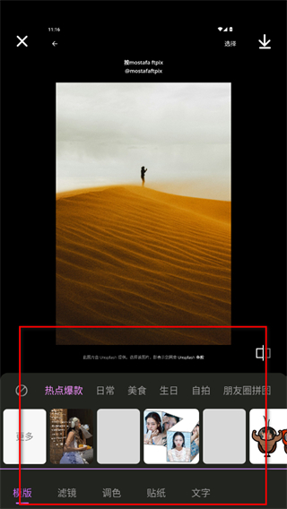 3、進入圖片編輯頁面后,可使用模版、濾鏡、調色、貼紙、文字等功能對圖片進行美化編輯。