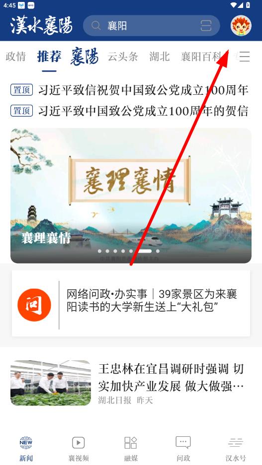 1、打開云上襄陽App,點擊首頁右上角的頭像圖標進入個人頁面。