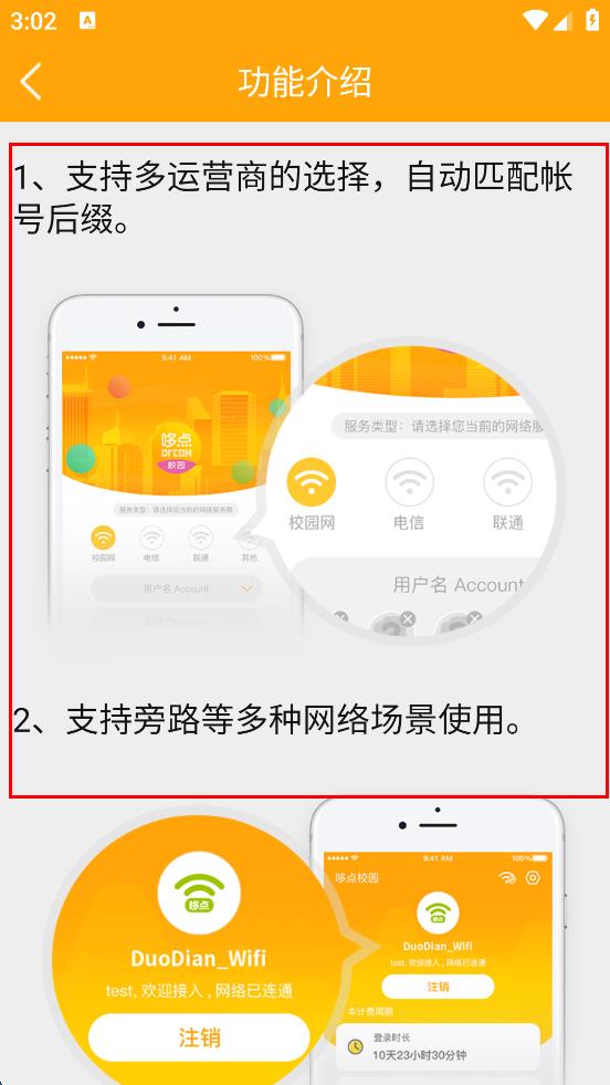 3、在功能介紹頁面,可查看第一條功能介紹,即支持多運(yùn)營商的選擇,自動匹配帳號后綴,還有相關(guān)展示圖輔助理解。