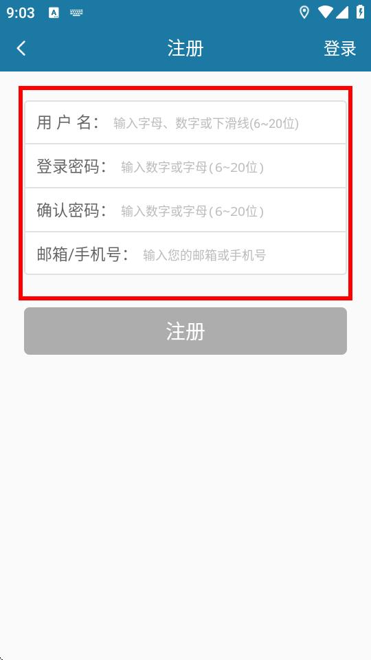 3、在注冊(cè)頁面,按要求填寫用戶名、登錄密碼,再次確認(rèn)密碼,并填寫郵箱或手機(jī)號(hào)。