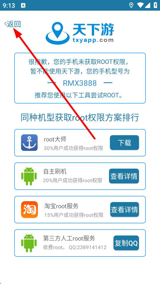 1、打開天下游應(yīng)用,若出現(xiàn)未獲取ROOT權(quán)限提示,可點(diǎn)擊左上角返回。