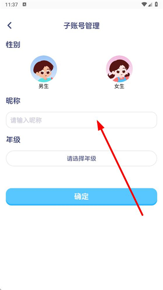 4、在子賬號信息填寫界面,選擇性別、輸入昵稱、選擇年級后,點擊確定按鈕完成子賬號添加。