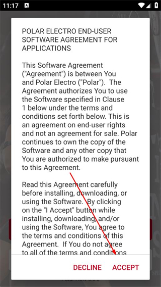 1、打開Polar Flow APP,在軟件協(xié)議頁面點(diǎn)擊ACCEPT。
