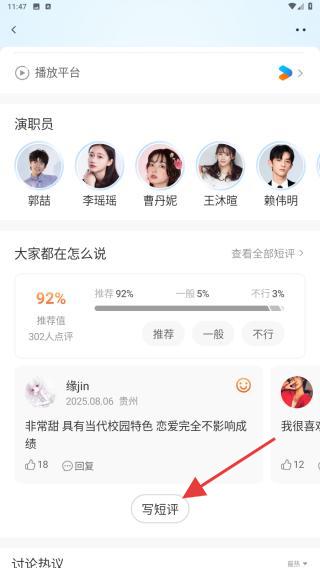 2、點(diǎn)擊一部電視劇后,向下滑動(dòng)找到寫短片的功能按鈕,點(diǎn)擊即可開始寫內(nèi)容。