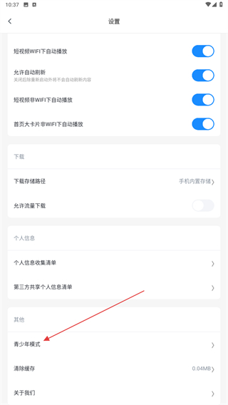 3、進(jìn)入設(shè)置的界面內(nèi),在個(gè)人信息下點(diǎn)擊青少年模式。