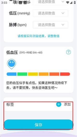 3、可選擇添加標簽,點擊保存,即可完成本次血壓記錄。