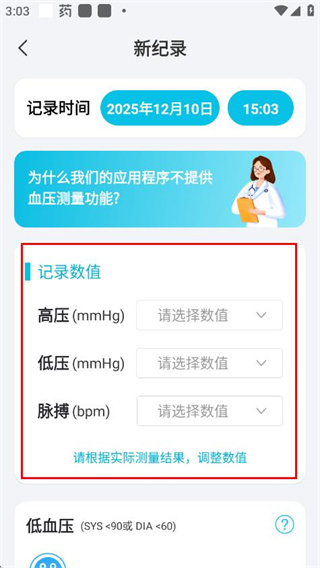 2、在新記錄頁面,依次選擇高壓、低壓、脈搏對應的數(shù)值。