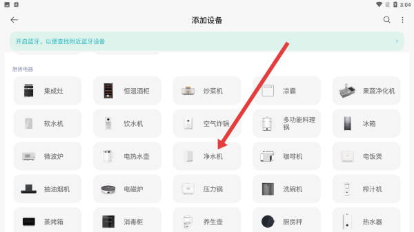 2、跳轉到添加設備頁面中,點擊廚房電器下的凈水機設備進行添加。