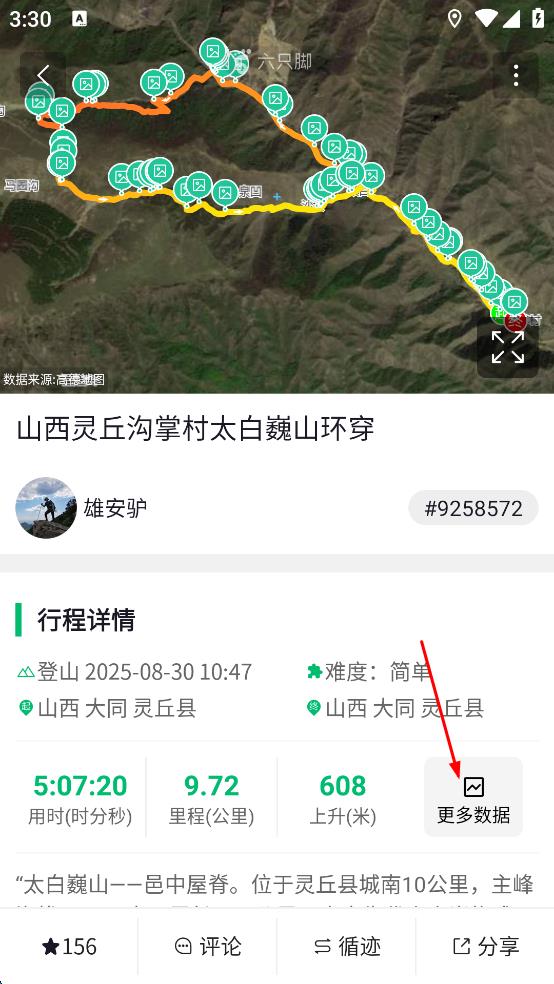 3、在路線詳情展示頁面,找到“更多數(shù)據(jù)”按鈕,點擊該按鈕,查看該路線的用時、里程、上升高度等更詳細的行程數(shù)據(jù)。