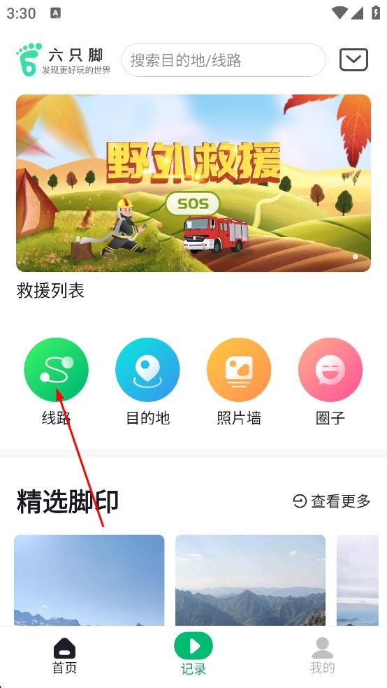 1、打開六只腳軟件,進入主界面后,點擊“線路”選項,進入線路游記頁面,在頁面的精選線路中找到需要的路線,點擊該路線。
