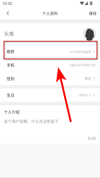 4、在個人資料頁面,點擊昵稱選項,輸入新昵稱后點擊保存,即可完成昵稱修改。