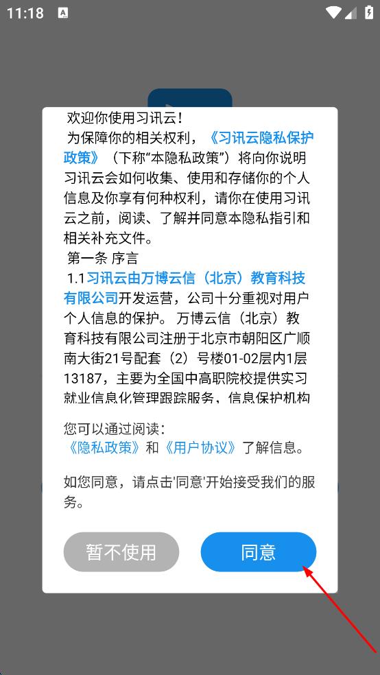 1、打開習訊云,在彈出的隱私保護政策頁面,點擊同意,進入學校選擇頁面。