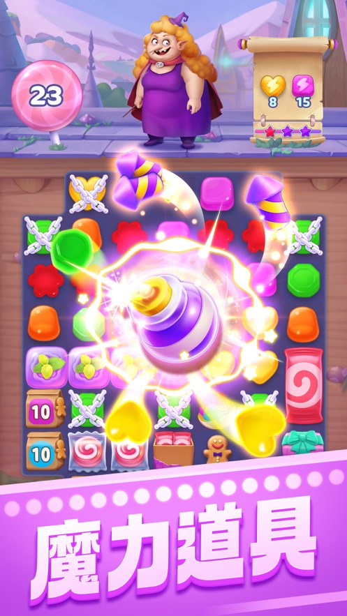 三個(gè)女巫一臺(tái)戲,要么射出幾個(gè)小怪獸,要么賜予幾顆硬糖,要么冰凍某些糖果...總之,她們會(huì)想盡一切辦法,不讓你安寧,唯一的辦法就是你必須盡快的消滅她們。