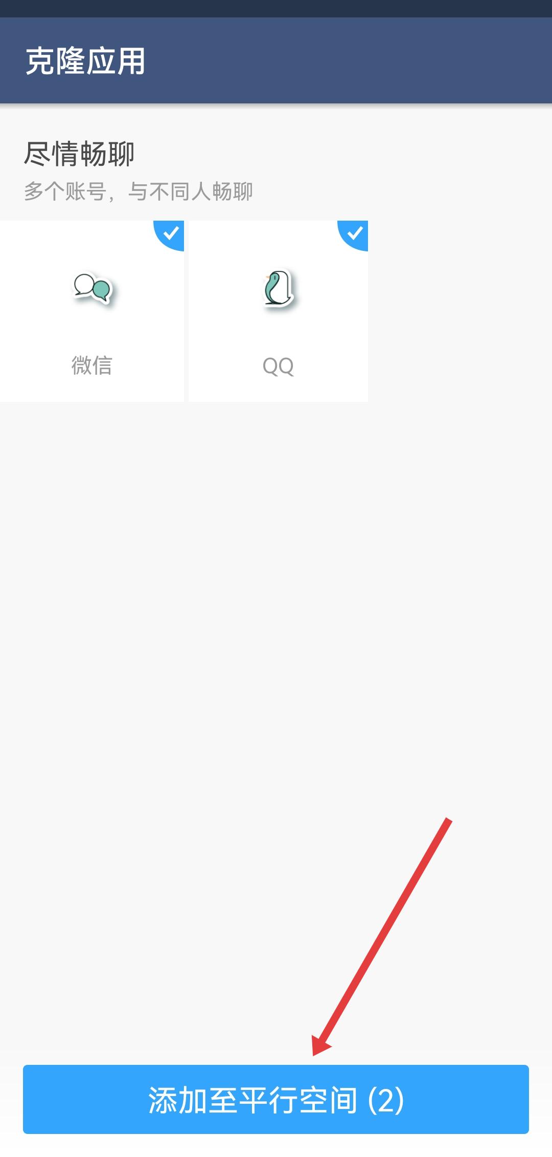 1、在克隆應(yīng)用頁面,勾選需要克隆的應(yīng)用,將應(yīng)用添加到平行空間。