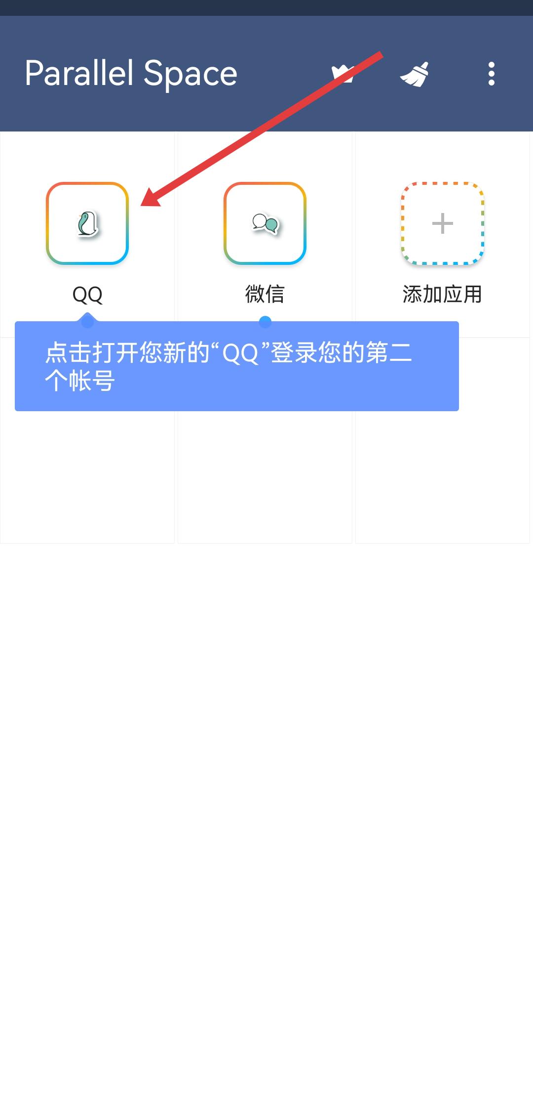 2、進(jìn)入平行空間主界面,點(diǎn)擊已添加的應(yīng)用圖標(biāo)如QQ,啟動(dòng)克隆后的應(yīng)用。