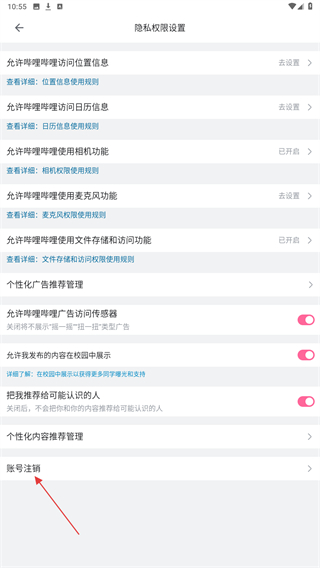 4、在隱私權限設置頁面中,找到賬號注銷選項,即可注銷。